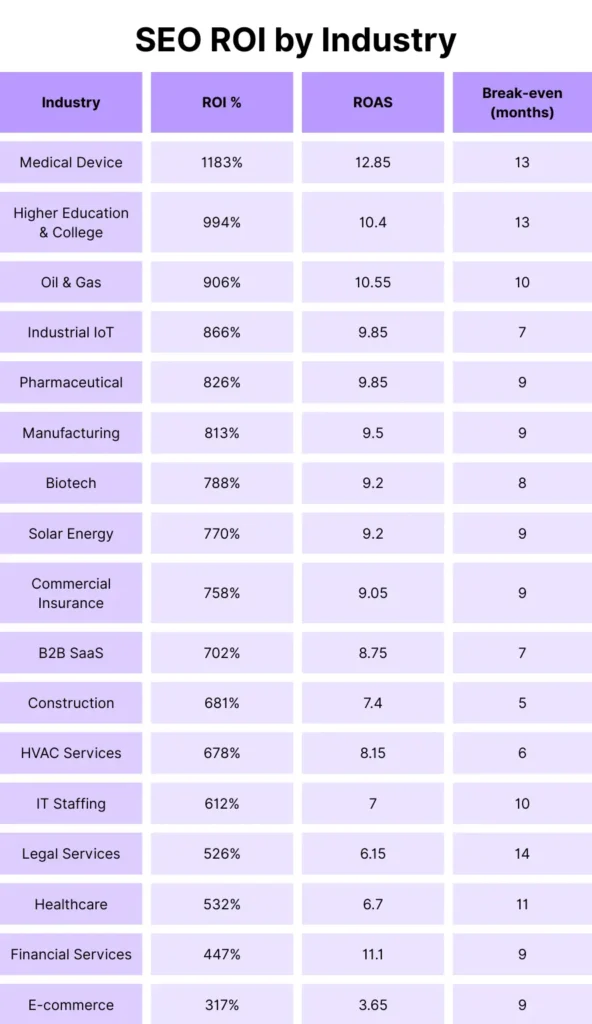 Medical device companies lead with an ROI of 1,183%. Higher education follows at 994%, and oil and gas posts 906%. Even traditional industries are extracting major value from SEO.